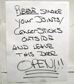 sign taped to the second-floor back door by one of the friendly folks at 301 8th Street Mail Theft Update: The U.P.S. man now says yesterday's stolen package could have been from Texas, and he vaguely remembers a return address name of "Jason." A second round of hypnosis begins on Friday. 7/18/00: Yesterday someone stole a piece of U.S. mail (a felony) addressed to Speak. The box in question was first left on the outer stairs by a postal delivery person, then moved to Speak's door front by the U.P.S. man who also left another package, this one containing Speak magazines. This morning, only the U.P.S. package remained, and it was torn open and several copies stolen. Speak's office is assumed to be in a secure building with a front-door buzzer system, but a recent survey indicates that more than three-quarters of San Francisco residents know the entry code. The U.P.S. man reports that the missing box was from the MidwestChicago he thinksand the sender mentioned Speak's back-issue trade offer on the outside. Because of the building's easy access, no one in the city has been ruled out as a suspect. So if you live in the Midwest, possibly Chicago, and you recently sent an offer of trade to Speak via the U.S. mails, please contact me immediately. 7/13/00: Working on an article about Yiddish literature in the summer issue, I e-mailed Speak writer Elisabeth Morse to check a fact regarding Jews being murdered in Russia in the fifties. The subject box for this exchange read "Stalin," and it remained so even after the two of us had moved onto other topics. I found this amusing and proposed to her that we keep it "Stalin" indefinitely. Before long I asked, without explanation, several other people to type "Stalin" into the subject box of their e-mails to Speak. I imagined disappearing and authorities, while searching my e-mail file for clues, discovering a long series of seemingly disconnected messages, all titled "Stalin." Then recently, scrolling through a long list of "Stalin" and "re: Stalin" e-mails, I suddenly felt depressed. Practically, it had become difficult to look up specific messages. Plus I wondered why so many didn't even question my odd request, and just went along with it. Here I was, editor of a national magazine, jerking around again. I shut down my computer and went home. It was all I could think to do. 7/12/00: "I Killed a Deer and Walker Percy Too" That's the title of a wonderful short story by Russ Franklin featured in Speak's summer issue. Intriguing as it is, this title does not appear on page with the story. In fact, the story runs sans title entirely. So what gives? More of Speak's arty creative license? Determined not to be like everyone else, the magazine has now abandoned mundanities like headlines? (Maybe next time we'll only print every other line.) While Speak's challenging layouts allow for such explanations, in this case it was merely a production errorthe technical explanation for which is far too complex to go into here. Simply put, "the headline dropped behind the photo." So I make this offer: be one of the first fifty people (U.S. residents only please) to call or send an e-mail with your mailing address along with the words "I Killed a Deer and Walker Percy Too" and you'll receive a free hand-corrected copy of the issue. And if your name is Russ Franklin: two copies! 7/11/00: I have a theory about technical support employees. If the society suddenly forced every one of them to take on a new line of work, and filled their positions with random, untrained peoplefarmers, clowns, grandmasnobody would recognize the difference. To wit: Speak's Web site designer Libby Kleine spent the better part of this evening on the telephone with four members of Concentric's support staff. The site was running fine, but our e-mail could only be received from a remote computerseverely reducing the convenience factor. "Maybe your modem's broke" and "Your program is probably corrupted" were among the super-insightful, super-technical fix-it suggestions. Then, finally, one employee, speaking to Libby for the third time tonight (they're getting together for lunch next week), matter-of-factly mentioned that Concentric requires a "%" symbol and not the standard "@" in the e-mail preference file. At least a grandma would have baked us cookies or something. |