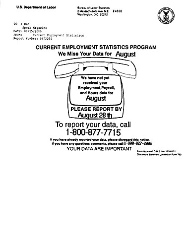 2/15/01: In less than two weeks, Speak will be vacating its office. The following items will not be traveling with us: a six-foot-tall industrial rack, a treadmill, a small refrigerator, a weight bench and free weights, a broken exercise bike, a futon mattress and frame, a laser printer in need of repair,a small glass side table, several metal desks, three large black rugs, four folding faux-wood long work tables, and thousands, literally thousands, of brand-new hardcover books. Prices, in order of appearance above, are $50, $200, $20, free, free, $50, $20, free, free, $30, free, $4 each. Speak is located at 301 8th Street, corner of 8th & Folsom, in San Francisco. Call before you come (415-431-5395) to make sure someone will be there. Thank you. 1/29/01: Last week sixty-six-year-old San Francisco Mayor Willie Brown revealed that he will once again be a father, this time of a baby girl due in the spring. The mother, thirty-eight-year-old Carolyn Carpeneti, is the mayor's chief fund-raising coordinator and "a great friend." A lovely story. Until you consider that, eighteen years from now, when the child is preparing to enter college, the elderly Brown will still be vengeful and corrupt. 1/28/01: Well, many things have happened since the last entry. Unfortunately a new issue of Speak isn't among them. Art director Martin Venezky scored the wonderful job of designing all of the print materials for this year's Sundance Film Festival and immediately let it be known, as kindly as possible, that the magazine was no longer a priority. Thankfully, he did occasionally update me on his exciting life, seamlessly referring to Mr. Redford as "Bob" ("That's what everyone calls him!"). He even invited me along to Sundance. (I refused, not wanting to feel complicit in the issue's massive delay.) Martin is now back from Utah and assures me that this week, three months after first receiving editorial, he will fully dedicate himself to Speak. Oh, and Bob didn't make it to this year's festival. He had other priorities. 12/12/00: In an unfortunate coincidence, Speak's office address includes the one word that I cannot comprehensibly say. Below is a short compilation of my efforts over the past five years: "301 Eighth Street" "301 Ace Street?" "No, 301 Eighth Street, as in the number eight." "301 Ace Street, #8?" "No, 301 Eight Street." "Got it, 3018. Now what's the street name again?" Fifty days until eviction 11/28/00: Rolling Stone magazine has just published its People of the Year 2000 issue. Winners include Sting, Tina Turner, U2, Don Henley(!), Pete Townshend, and Paul Simon. (What, no Ernest Borgnine?) Did any of these winners even leave their houses last year? Somewhere Jimmy Buffet's friends are telling him he was robbed. 11/27/00: Well, this whole chronicles idea hasn't exactly been a smashing success. Sitting on my laptop is a scrap of paper with scribbled notes for potential entries. Here's what it says: 8th/Ace, telephone line on, trash alley fine/ziplock, XO busy sig, R.S. of the year. To save me the effort of writing these out, everyone is welcome to call directly and request any of the above anecdotes. 10/5/00: The Blue Angels arrived in San Francisco today. The Navy flight squadron annually performs breathtaking loops and spins in tandem over the Bay for suburbanites with picnic baskets and grandkids. A sort of Harlem Globetrotters of the U.S. Military, the Blue Angels are primarily an expensive public relations team designed to enhance the image of the Navy and recruit impressionable young men. Of course most of these teens who dream of wooing ladies with their bad-ass planes wind up crawling through muddy obstacle courses in South Carolina for twelve grand a year. But no matter, we're all on the same team. In the days leading up to the weekend's big performance, the Angels put on another show of sorts: a series of practice runs directly over the city skyline. It's often deafening and, depending on your faith in the military, somewhat unnerving. Every year citizens protest the excessive noise, potential danger, as well as the cost of maintaining the high-priced squadronwho, frankly, look a little like reincarnated Hitler Youth. I mostly stay quiet. I figure we're all on the same team, right? Right? 9/29/00: In an episode titled "Beaver, The Model," from the television series Leave It To Beaver, Beaver mails picture of himself to a modeling agency and gets back a congratulations declaring him a top prospect. His father cautions that it's a scam, but rapscallion Eddie Haskell convinces young Beav that old Ward is holding him back from a promising modeling career out of jealously. Beaver signs on and soon receives multiple demands for a thirty-dollar agency fee. Beaver ignores them until the agency threatens legal action. Frightened, he hires lawyer George Compton, a family friend. Though Beaver has only forty-six cents, the lawyer agrees to handle his case. He accepts Beaver's money, too, warning him that anytime he can't go to his father for help, it's going to cost him something. Several months ago Speak received notification by fax from the U.S. Department of Labor that it had to provide payroll statistics every month. This meant filling out a government payroll report with personal employee information, hours, and salary. It sounded like a scam so I called the number on the cover sheet. "Department of Labor," a woman answered. Ha, ha. It was as easy as calling the sandwich shop down the street. Now I knew it was a scam. The woman informed me that Speak was randomly chosen to participate in a government salary survey of various occupations. I asked what if a company, hypothetically, only had one employee on payroll, and this employee only worked, say, occasionally? Surely this wouldn't be worth the government's trouble, plus it would unfairly skew the statistics. "Once you've been selected, you're legally required to report," she answered. "Scam or not, I'm not doing it," I thought. "They ca