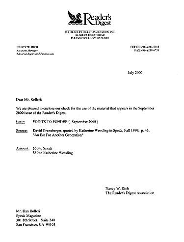9/27/00: A new issue of Speak mails this week, and it's nearly as good as some of the other issues! In other news, the magazine has been informed that its office rent will triple or quadruple at the end of its lease next year. The dot-com revolution is here, and the only people laughing are landlords, scooter manufacturers and Banana Republic. One by one, 301 8th Street tenants are leaving, even the photographer next door who was here before the idiot landlord failed his first spelling test. Word is everyone is moving to Oakland or Portland or Montana, but I have a funny feeling some of them are being killed off. Now I have to find a well-paying second job that will allow me to afford rent and groceries in what is becoming Atlanta with hills. There are lots of available jobs in San Francisco, mostly with vague companies with names like Gyrotech Solutions, Inc. So far I haven't signed on, passing up the generous salaries, flexible hours, company bungee jumps and softball leagues. Two months ago I quit a second job at a local print magazine soon after the publisher decided to transform it into an on-line magazine. Often I was paid to sit with the Web site designers as they passed out pages of graphs with tiny rectangles and bluffed their way through hours of explanation about the architecture of this nonexistent site. I've heard that dot-commers take lots of meetings. The other night I was driving home and passed a Chevron station. "Help Wanted. Night Shift. Good Salary and Benefits," the sign read. I considered it, really considered it. I could bring my laptop, get paid while working on Speak, and have my days free. Anything was better than those stupid rectangles. That's when I realized it was time to get out of town. 8/31/00: "The arrogance of every generation is to think that the onward march of world history led to this peak that is its generation and now it's going downhill." This from David Greenberger, publisher of The Duplex Planet, in Speak's Fall 1999 issue. The line reappeared earlier this year in Utne Reader, which occasionally reprints quotes from Speak interviews. Then two months ago, I received a call from Reader's Digest, asking to purchase a copy of the issue in which the Greenberger quote appeared. I said I'd send it for free, but the woman on the phone insisted on paying, reciting an American Express number to me. Silly, I thought. I ignored the credit card number and only took down her address (Reader's Digest Road, impressive!). Reader's Digest was the only magazine my dad ever read. When it arrived each month, he would remain at the kitchen table after dinner and read through his magnifying glass for hours. Sometimes he'd fall asleep there, awkwardly kneeling on the chair, his face pressed down into the chunky magazine. He looked like a deflated "S." A few weeks later, I received two sets of Reader's Digest contracts, one for me and one for the Greenberger interviewer Katherine Wessling. They were considering reprinting the same quote in an upcoming issue, and offered to pay each of us $50 for permission. Silly, I thought. I wanted to decline the payment, but it probably would have caused them more trouble than if I just accepted it. My dad saved all of his Reader's Digests, neatly lining the bookshelves in the basement. As far as I know, he never went back to read any of the old issues, but if he ever wanted to, there they were, perfectly organized by volume, issue and date. Our Reader's Digest checks arrived last week. They decided to publish David's quote in the "Points To Ponder" section of the September issue. It's a good quote, and nicely appropriate for the magazine's generation of readers. Still, the contracts, the payment, hell, the fact that something from Speak appears in Reader's Digest, all seem very silly. My dad's Reader's Digests still stand in their designated place on the basement bookshelves. The ones in the lower-right corner are from 1983, the year he died. I plan to squeeze in one more issue this weekend. It's silly, I know. But I think he would've gotten a kick out of it.